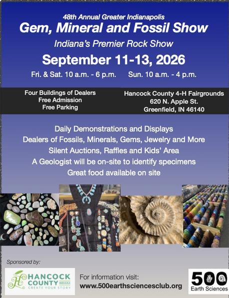 The 500 Earth Sciences Club hosts an annual gem, mineral and fossil show the weekend after Labor Day each year. Admission and parking are free. This year there will be four buildings at the Hancock County Fairgrounds in Greenfield are filled with over fifty vendors. They offer a dazzling array of minerals, fossils, rocks, jewelry and other items for purchase. Beads and jewelry making supplies and lapidary supplies are for sale. A food vendor is also on site.